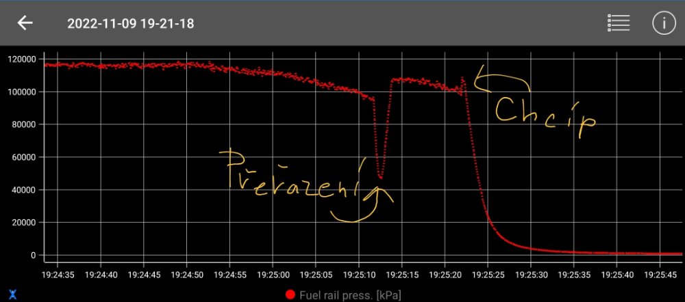 Při jízdě čidlo ukazuje rozumné hodnoty, zde i záznam z čidla při jízdě až do chcipnuti, to nastalo při jízdě do mírného kopce. Pokud by byl problém s čidlem tlaku paliva, očekával bych, že na grafu bude nějaký výkyv. I pokud by byl problém v pal. Filtru, případně v těsnosti palivové soustavy.