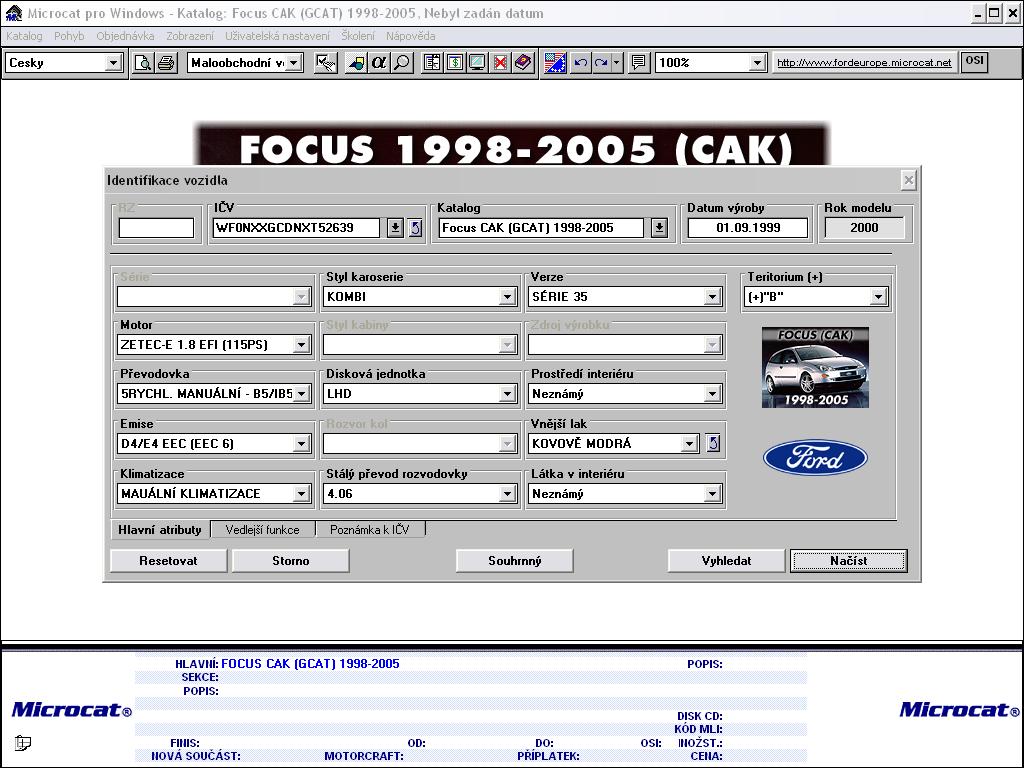 Focus, (+)"CZR", Zetec-E 1.8 EFI (115PS), 5rychl. manuální - B5/IB5, 2000 EEC (EEC 7), Bez Klimatizace, 5 Dveřový Sedan, LHD FWD, 4.06, Série 32, Interiér Midnight, Modrá Ink (met), Martre