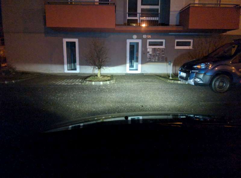 Tu je vidieť, že moje halogénové svetlá jednak nie sú asi úplne dobre nastavené a jednak aj silu F2 žiaroviek, ktoré kompletne presvietili obyčajné žiarovky.
