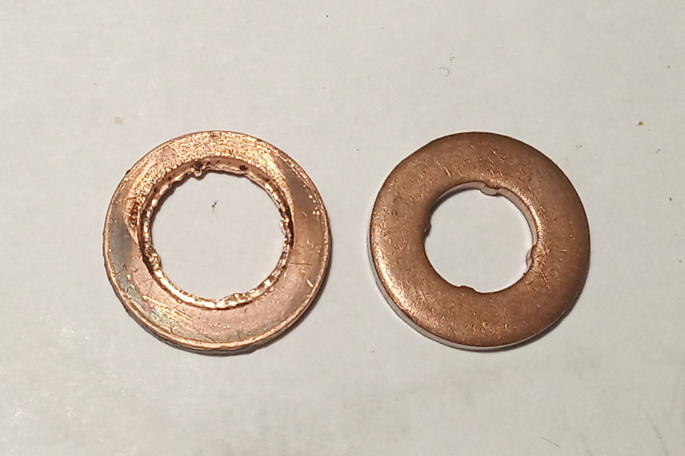 Prakticky přesně po roce výměna stejného vstřiku. Porovnejte rok (!!!) staré těsnění s novým. Asi není měď jako měď.