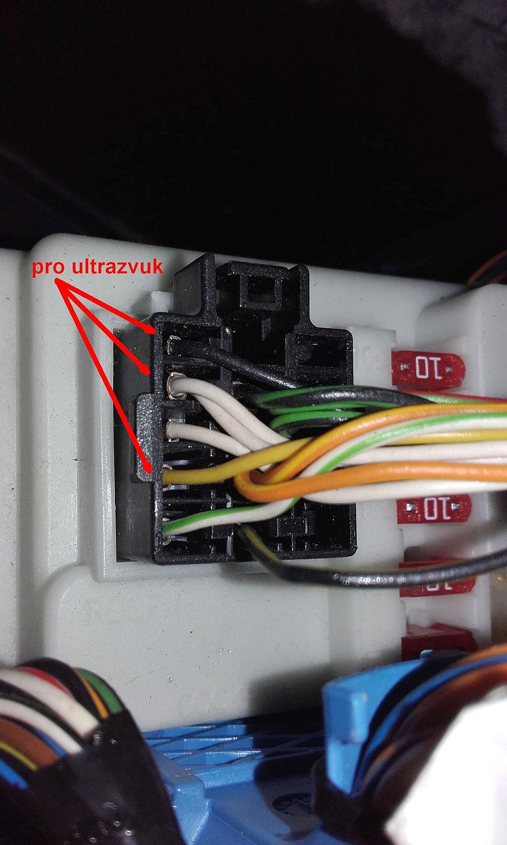 Tak to vypadá, že kabel vede jen do konektoru C57 (snad je někde za schránkou před spolujezdcem). Koukal jsem na konektor C118 a z obou stran bílý drát na pozici č. 8 chybí. Tahat drát ovládání ultrazvukových senzorů napříč autem, přes A sloupek, jak jsem koukal, to je obzvášť výživné. Do dveří ani koukat nebudu, je to nejspíš zbytečné.