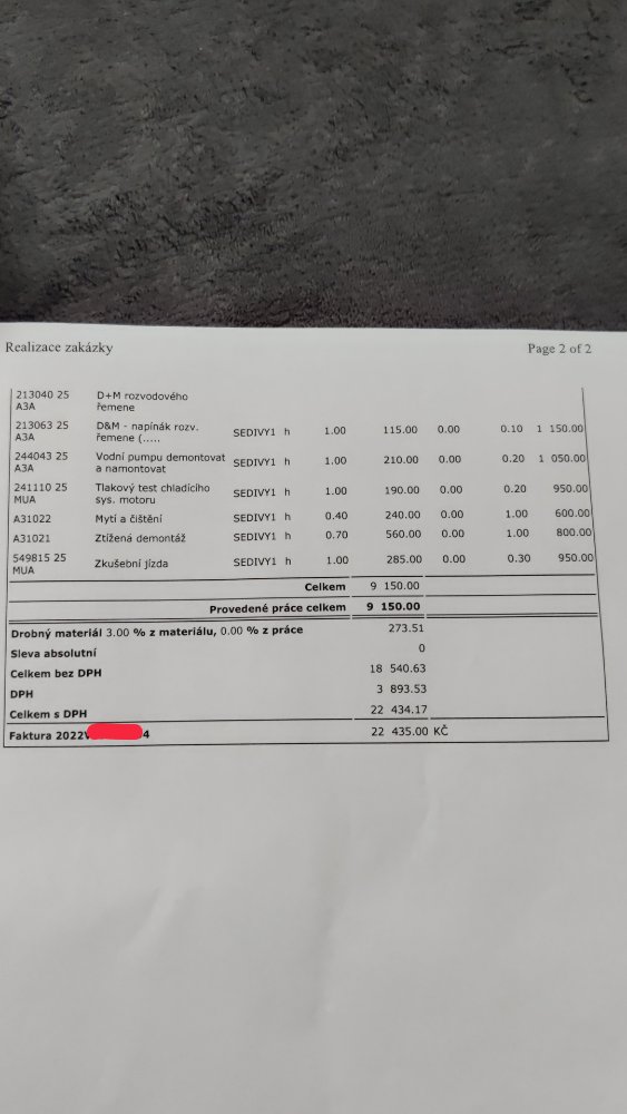 Rozvody byly dělány z důvodu tekoucího těsnění vodního čerpadla. Které je samozřejmě pod deklem rozvodů. Tam cena byla 22tis a nějaké drobné. Tak jsem se ptal, o kolik by se navýšila cena pokud budu chtít tu kontrolu olejového čerpadla. Prý tak o 3-4 tis. Tak si říkám, že to ještě jde. No doma jsem si pro jistotu napsal mail do servisu s výše zmíněnými požadavky. Jaké bylo moje překvapení, bohužel fakt nemilé, když mi nabídka dorazila zpět a cena byla o 16tisíc vyšší, než u technikem vytisknuté již provedené zakázky přímo na pobočce. V mé nabídce je vypsaný každý šroub a těsnění, které sice naúčtují, ale už pak nikdo nedokáže ověřit, jestli je to opravdu použito.