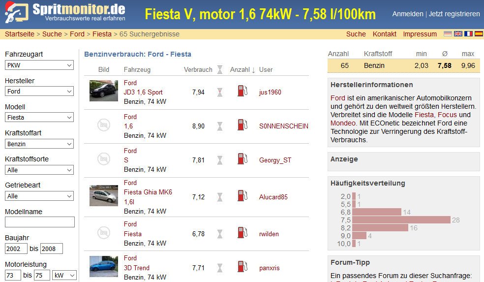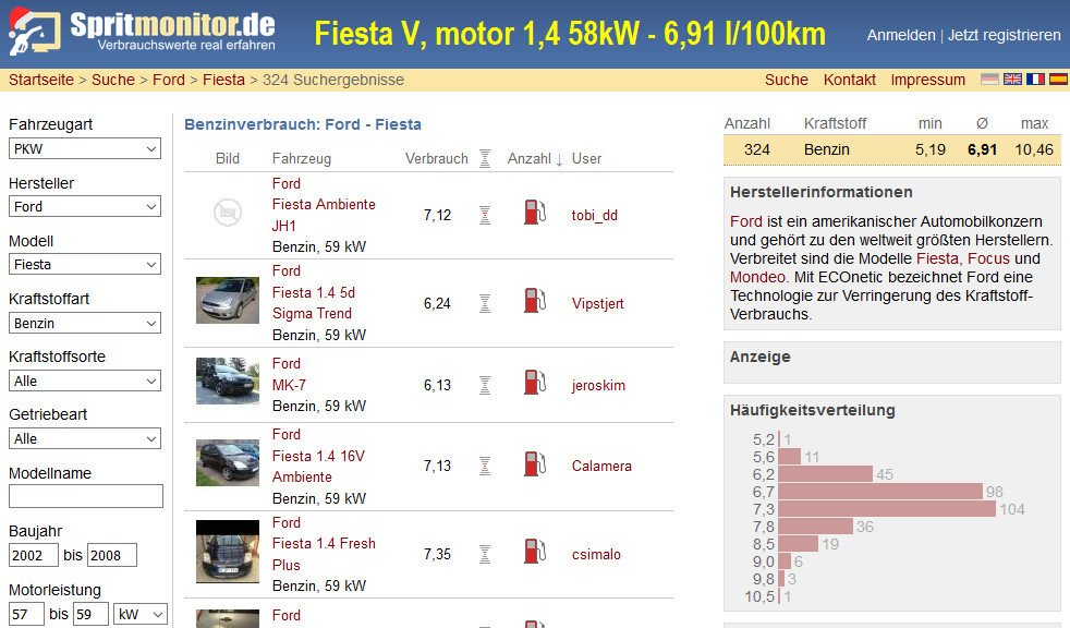 LeonardoTM píše: 21.12.2020 01:19Ještě doplnění na téma spotřeba - z volně dostupné databáze uživatelů je možné zjistit, že Fiesta V. generace jezdí se všemi motory průměrně za 6,9 l/100km. Pouze u nejsilnějšího motoru 1,6 je to trochu více (ale je tam méně uživatelů). Statisticky nejrelevantnější jsou tedy ty hodnoty pro motory 1,3 a 1,4. Ale záleží, jak se ta data vyhodnotí, kdo by chtěl, viděl by v tom i náznak nižší spotřeby pro motor 1,3 (modus):Sirk9 píše: 21.12.2020 00:09 Jak se řeší rozvody u těchto motorů? Po kolika kilometrech. Ještě máme dvě auta vyhlidnuta,tak uvidíme.