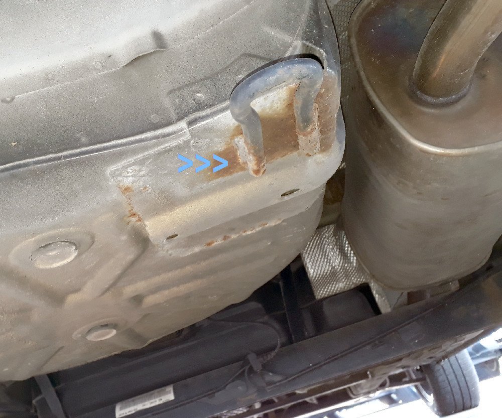 Kritické místo je např. příčka uprostřed auta, která zpevňuje podvozek a asi drží brzdové a palivové vedení. Na ní se může objevovat povrchová koroze a podle jejího stavu je možné usoudit, co auto "zažilo". U ojetin nad 10 let nezáleží už tolik na věku a km, ale spíš na podmínkách a péči (myčka, garážování atd.). Někdo se před prodejem (nebo kvůli STK) může snažit podvozkovou rez řešit ochranným nástřikem (ten je sám o sobě dobrý, ale musí se udělat pořádně), což ale může být jen "zakrývací" manévr. Lepší je podle mne vidět, jak to ve skutečnosti vypadá a ošetřit si to pak až sám. Zde je auto z roku 2007 se skoro 150 tkm ve výrazně lepším stavu, než auto z roku 2006, co má "jen" 95 tkm: Praktický tip - pohledem pod zadní nárazník na okolí tažného oka je možné rychle zjistit, jak to bylo s péčí o auto (bez ošetření to tam vcelku rychle rezne)- viz modré šipky na fotkách. Další slabé místo jsou úchyty žáruvzdorného krytu výfuku (žluté šipky), kde vlivem galvanické koroze (kontakt železo-hliník ve vlkhém prostředí) často urezne část plechu a ten se pak hýbe a drnčí za jízdy. Řeší se to většími podložkami pod šrouby (pokud tam jsou, už se o to někdo "postaral"). Tady je třeba ta příčka v dost špatném stavu, zatímco úchytu výfuku naopak v dobrém...