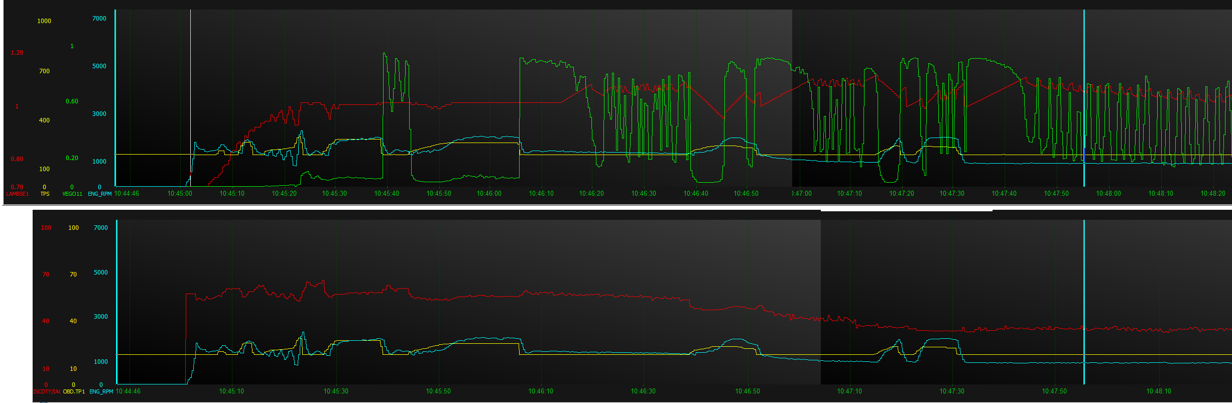 Z grafu 10:45:20 je vidět co dělají otáčky(ENG_RPM). 10:45:28 je vidět jak po přidání plynu (TPS) směs chudne (LAMBSE) - asi důvod dusení.