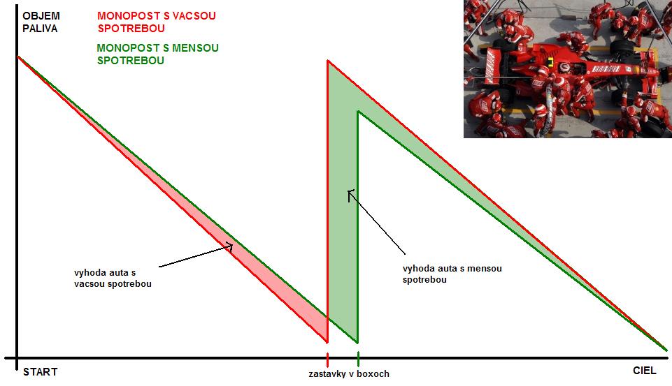 jasne ze to neni len o spotrebe a pre nase pripady to takmer nehra rolu, ale ma to zaujalo, tak sem si dovolil, ze sve zahradky, mensi graf, ktory ukazuje vyhodu nizsej spotreby v pretekoch F1. pre zjednodusenie len na 1 pitstop