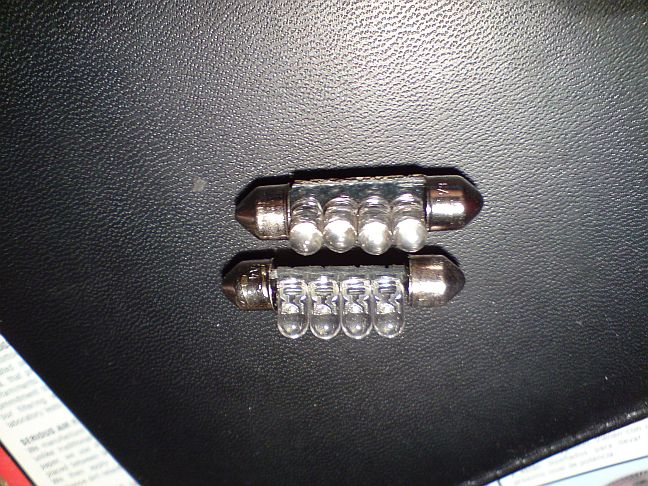 Tak som sa konecne prinutil , respektive to hnusne zlte podsvietenie SPZ ma prinutilo a vyrobil som si LED SUFITky na osvetlenie SPZ. U nas na Slovensku som nasiel led sufitky bielej farby v rozmedzi od cca 300-360skk za par , co je trosku vela. A tak som rozobral sufitku, aby som mal tie krajne objimky. Kupil si 8 vysokosvietivych LED (5200mcd) , zapojil 4 do serie a uz svietime krasne na modro-bielo.