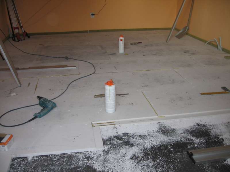 V obytných místnostech jsme po vytrhání parket a podkladových desek instalovali podkladové desky fermacell na které jsme pak taky přímo lepili podlahu Thermofix.