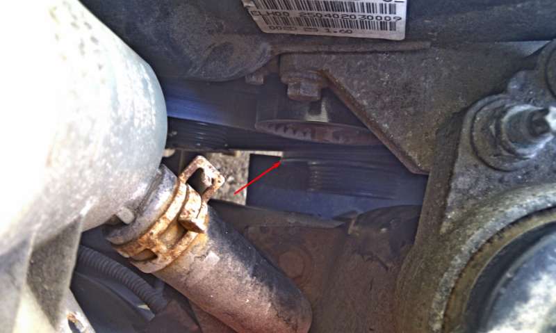 Za poslední týden jsem si všiml změny zvukového projevu na Fofíkovi. Zvuk motoru je pravidelný, nicméně je výrazně hlubší, především se to projeví v interiéru (řekl bych jsou cítit o něco větší vibrace). Je to slyšet při volnoběhu, když jsou otáčky kolem 800. Ihned po nastartování to je OK, pak klesnou otáčky na volnoběžné a je to znát. Subjektivně se mi zdá, že motor i trošku víc vibruje (hlavně kolem 800 - ale předtím jsem to samozřejmě nezkoumal). Když jsem koukal pod kapotu, nenašel jsem nic, co by se mi nepozdávalo, jen se mi zdálo, že trošku hází ta nejspodnější "jakoby dvojitá" řemenice viz. obrázek. Házení je vidět na hraně kam ukauje šipka, ale nezdálo se mi že by se nějak klepal řemen. Ale netuším jestli neházela už předtím. Jinak jízdní vlastnosti beze změny.