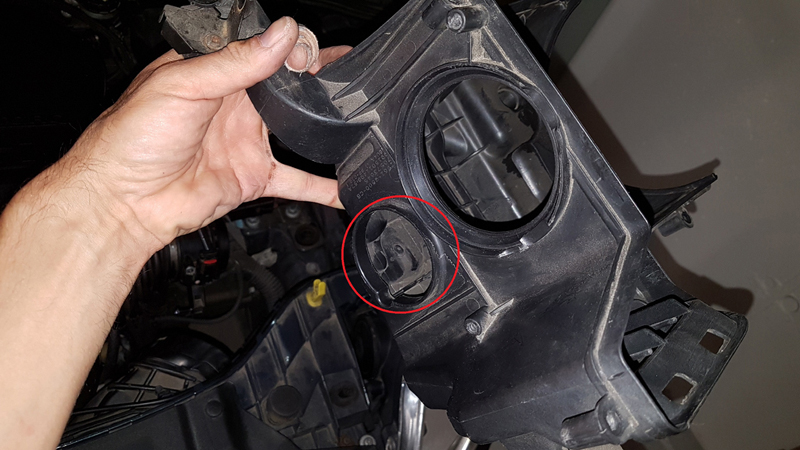 Našel jsem ale mnohem pravděpodobnější problém, který to způsobuje. Zjistil jsem, že mi v autě zřejmě několik věcí chybí :cry: Za prvé mam v airboxu pod dírou pro filtr druhou menší volnou díru (zakroužkováno červeně), tudyma to aktuálně saje horký vzduch z motoru a to je myslím jeden z důvodů, který negativně ovlivňuje hodnoty z MAF.