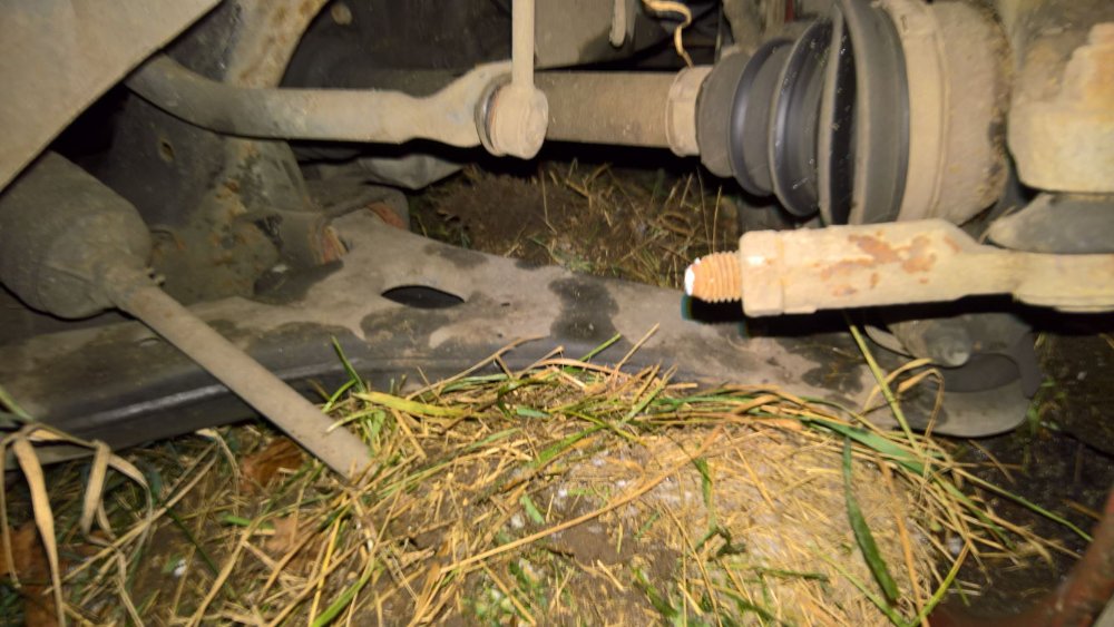 Už jsem se dostal i k fotkám. Já bych řekl, že rameno by to být nemuselo, což je horší, protože další na řadě je nápravnice. To rameno by mohlo mít ohnutej čep v hlavním silentbloku, ale poznat to neni. Tyčka řízení to odnesla a už je objednaná i s čepem a tlumičema. Jde mi o to, že když manuálně srovnám kolo do směru tak je posunutý směrem dopředu. Nebo je ohnutý celý auto :bebng: