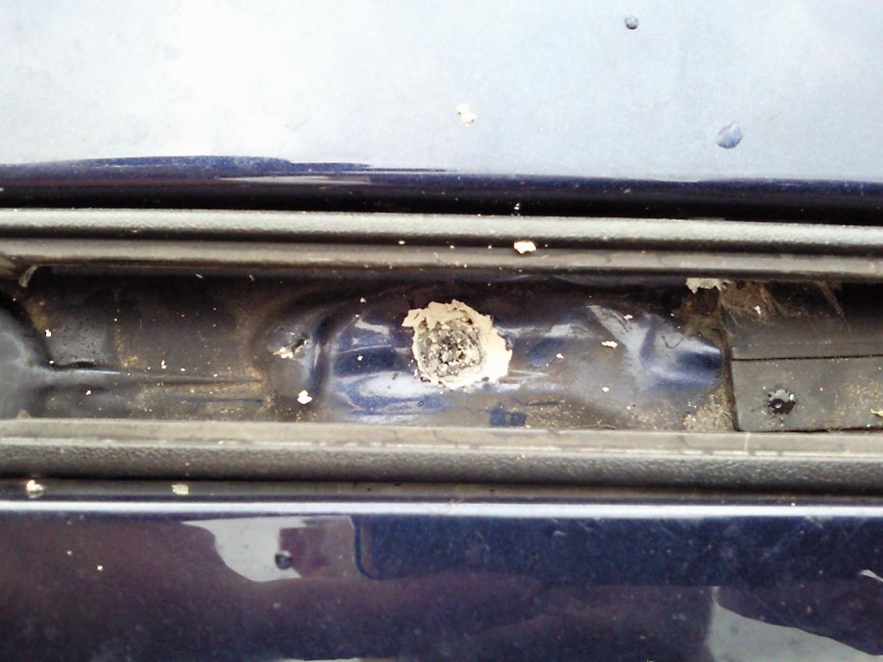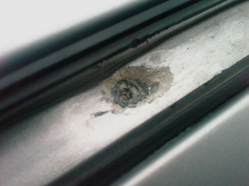 Velmi opatrne vyrezte uprostred otvoru dieru s priemerom asi 1 cm. Pamatajte, cim menej silikonu vydlabete, tym lepsie! Dostante sa az na pod vrstvu silikonu. Pokial ste narazili na kov (strechu), je zle. Pokial ste objavili plast, ste na dobrej ceste. Je to taka loteria, lebo diera sa nemusi zakonite nachadzat presne uprostred. Napriklad u mna boli oba zadne cca. o 1 cm vychylene.
