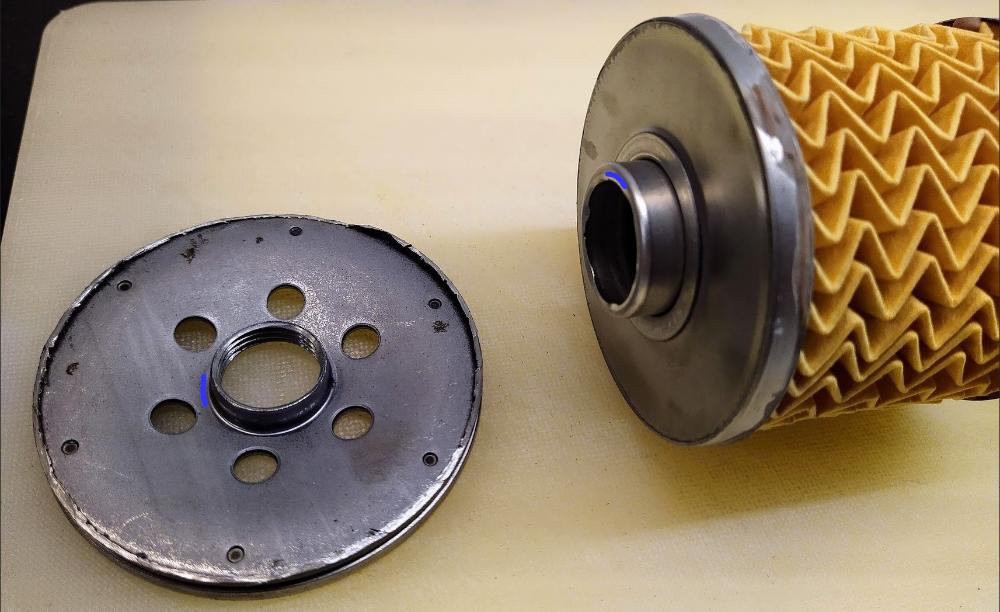 Těsnění mezi vložkou a víčkem se obešlo bez jakéhokoliv těsnění (elastomeru nebo tmelu) - těsní jen modře označené plochy plechových výlisků proti sobě, jen díky přítlaku pružiny. I na bloku motoru odděluje vstup a výstup filtru (resp. znečištěný a přefiltrovaný olej) jenom závit (zde 3/4").