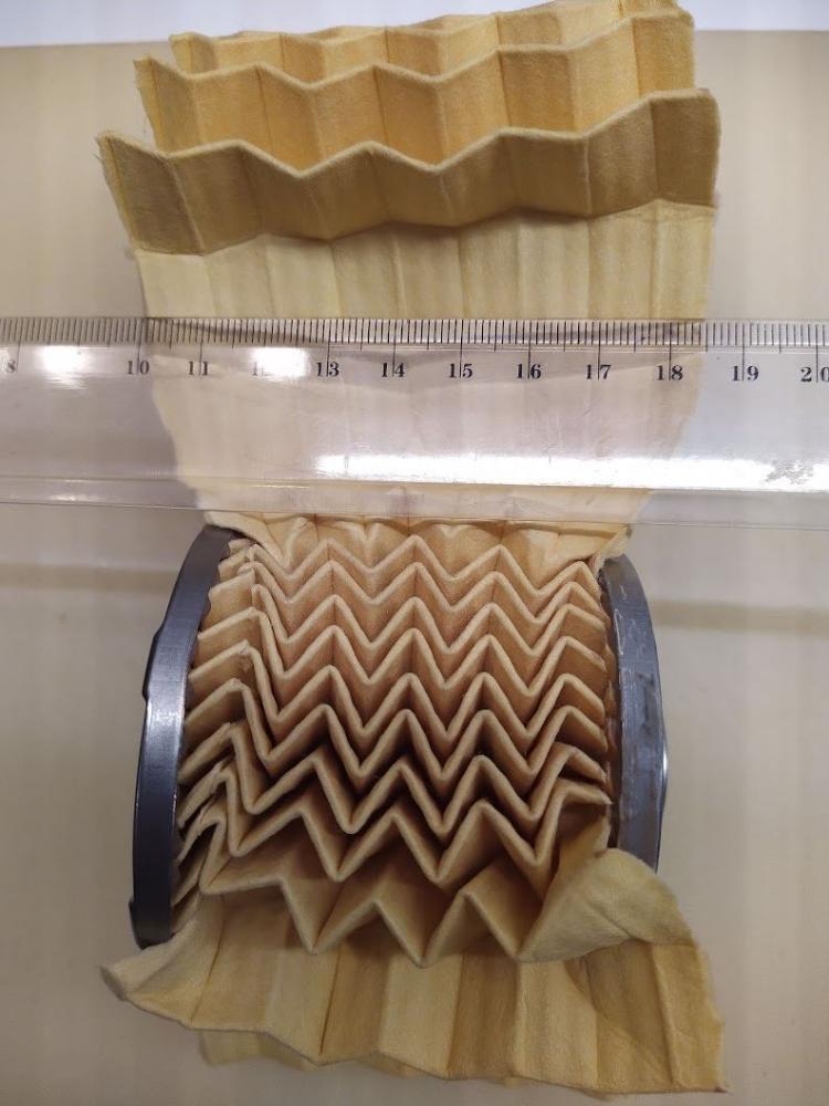 Po odříznutí filtračního papíru je zřejmé, že výška filtru bez skladů při stejné ploše by byla o cca 50% větší. Jednoduchý trik pro zvětšení filtrační plochy.