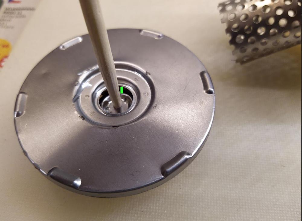 Obtokový ventil - otevřený. Subjektivně mne překvapila dost velká síla, nutná k otevření ventilu (otevírací tlak dle výrobce je 1,15bar). Zeleně vyznačen zdvih ventilu.