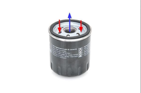 Olej od čerpadla vstupuje napřed do vnější části filtru (červená šipka), prochází filtrační vložkou a vystupuje středovým otvorem (modře) zpět do bloku motoru, kde je olej dále rozváděn.