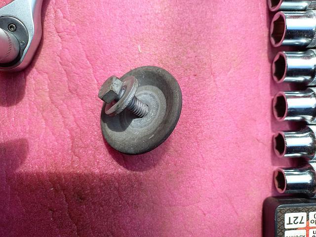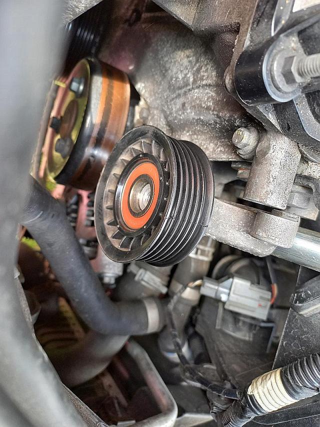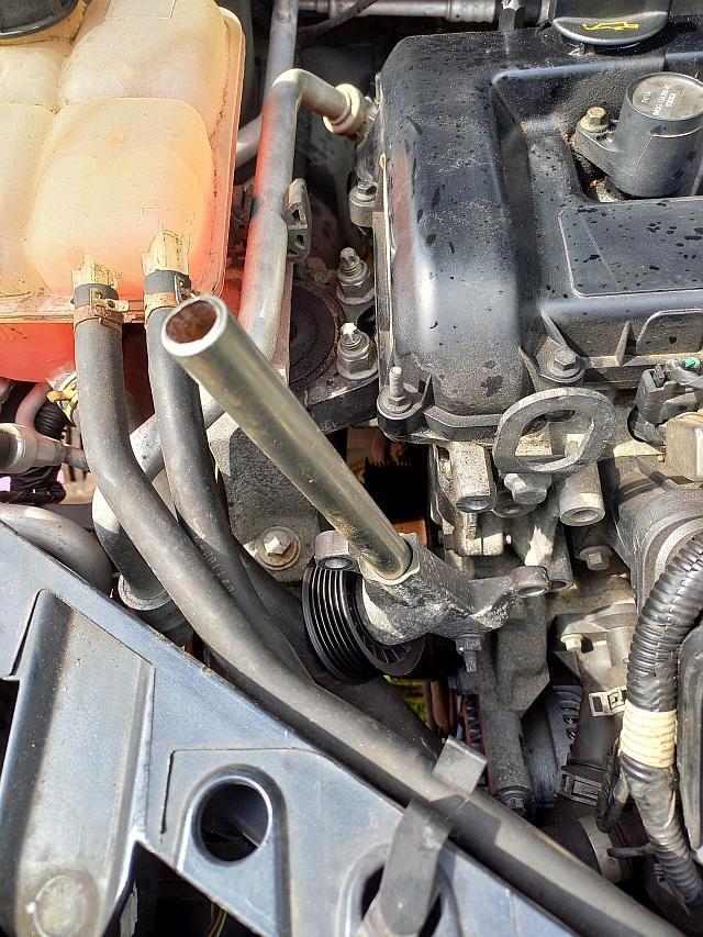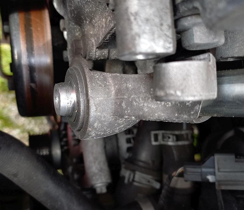 Řemen klimatizace byl podstatně horší, jelikož přípravek na to nemám, ale taky jsem to nakonec přepral. Co mě překvapilo, je uložení řemenice kladky, kterou jsem také měnil. Čep, na kterém je nasazena, sahá pouze cca do poloviny šířky ložiska, pak je to stáhnuté už šroubem. Zvláštní, tohle jsem zatím nikdy ještě neviděl:FF II 1.8 16V/92kW Kombi r.v.2009