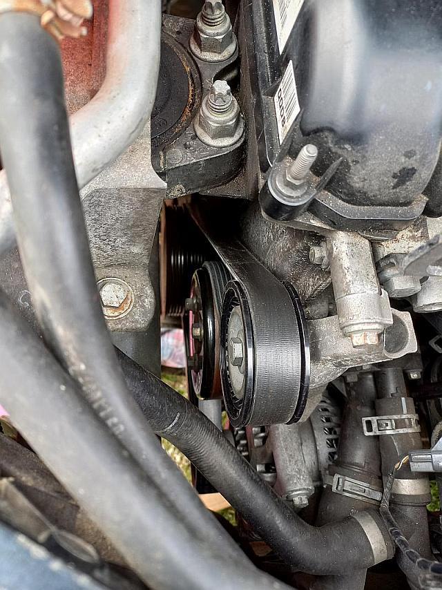 Já ji tam třeba už nemám. Starý se řízne, povolí se altík a jakoby se vyklopí. Do otvoru v držáku altíku se strčí tyč a po nasazení nového řemene se to přez tyčku dopne, chytí se šroubem a pak jen dotáhnou šrouby. Existují na to i přípravky, ale tento postup byl namalován i na obalu nového řemenu. Řemen na klimu se taky dá bez přípravků. Je to sice jebačka, ale při troše šikovnosti se to dá.
