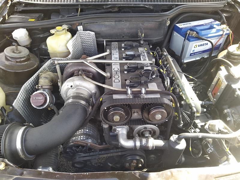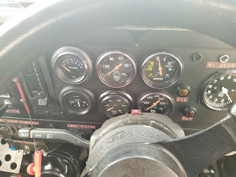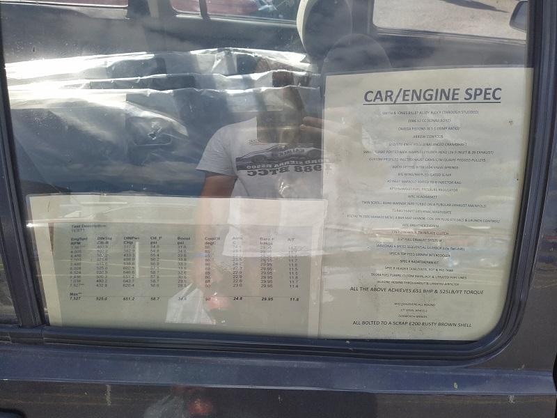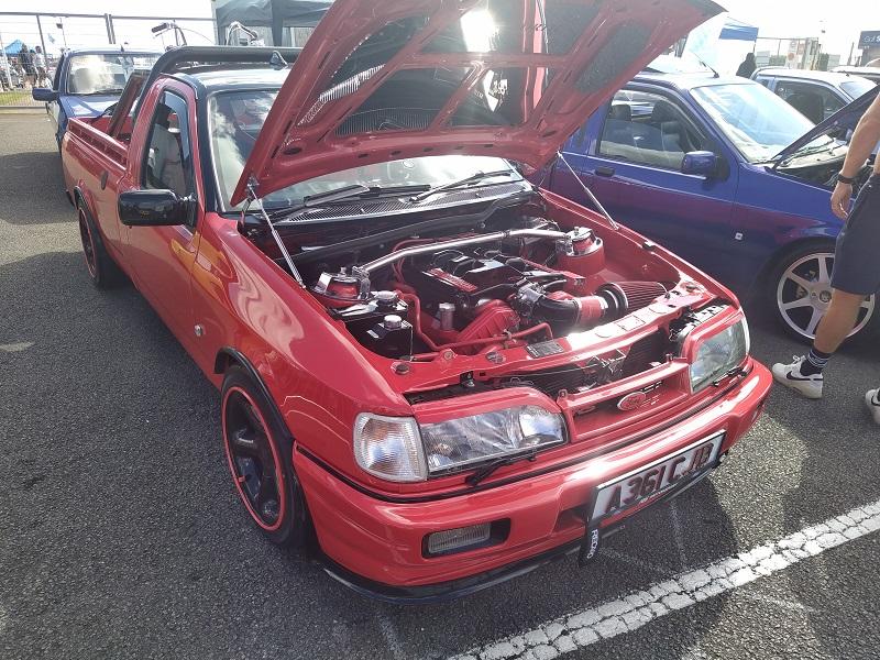 Chtělo se to vrátit nohama trošku zase na zem a myšlenkama zpátky do reality, jenže ono to vlastně moc ani nešlo. Ikdyž tam stojí něco v původním stavu a na oko to není žádná sporotvní verze, u nás to člověk s největší pravděpodobností neuvidí, a pokud ano, tak rozhodně ne v takovém stavu. Krásným příkladem dva vedle sebe stojící Escorty MK3 veverzi Courier, dvě krásné sériové Fiesty MK2, dvě naprosto krásné Anglie, nebo v řadě stojící 4 nádherné Fordy Capri. Chvíli jsme zase nevěděli, kam se dívat dřív, bylo tam toho tolik, že se to dalo těžko vstřebávat. Vedle stojících Capri stál z venku nádherný Ford Escort RS Cosworth - na první pohled sériový - tento moment dlouho nevydržel, když jsem viděl jak velké měl turbo, nezbývalo nic jiného, než nad tím zakroutit hlavou...Sotva tohle člověk rozdýchá, naproti stojí Escort MK1 kostička ve verzi kupé-kombi...Samo o sobě je tato verze velice vzácná, ale majitel zřejmě taky dobrodruh - motor Cosworth YB a auto na 13-ti palcových kolech s nízkoprofilovými pneumatikami. Jestli toho blouznění na slunci nebylo do té doby málo, tak kousek od těchto aut stály v řadě 4 Sierry ve verzi pickup....Dvě s pohonnou jednotkou V6 a dvě s jednotkou Cosworth YB...Už se začala pomalu dostavovat agónie z toho všeho kolem, ale ten hlavní " úpal " teprve přišel. Vrátím se nyní ke zmíněné Sieře, která byla na trati - ano, ten kombík na 17" plechových kolech, který střílel za každým kvaltem a udolal okruhový Escort RS Cosworth...Otevřená kapota mě vyloženě lákala, abych tam strčil hlavu a zjistil, co za peklo se tam schovává. Nijak zvláštní překvapení se nekonalo, protože už z jízdy na trati podle zvuku a projevu jsem věděl, že to bude určitě YB od Cosworthu, a samozřejmě, že bylo. Vedle motoru velké turbodmychadlo BorgWarner...Na bočním okýnku za řidičem byl na papíru celý rozpis úprav auta. Pokusím se fotku nahrát, protože to bylo hodně zajímavé čtení. Každopádně Sierra měla 651 koní , 525 Nm kroutící moment, sekvenční převodovku a mnoho dalších věcí. :irre: Rovnou mohu prohlásit, že mě to počtení docela odrovnalo a už jsem se nezmohl ani na to, kroutit nad tím hlavou - obvzlášť, když jsem viděl ty plechové disky, auto, ve kterém nebyl ani rám a korunou tomu všemu byl volant - obyčejný sériový volant z prvních modelů Sierry - takový ten, co má trojúhelníkový střed a jen dvě ramínka dole...V tu chvíli jsem přestal na chvíli mluvit a šel kam mě nohy nesly...