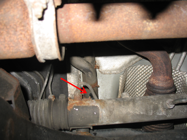 Zjistil jsem, že mám pod autem loužičku. Natáhnul jsem se tam s foťákem zepředu a podařilo se mi zachytit místo kde vzniká kapka. na obrázku jsem to místo označil šipkou.