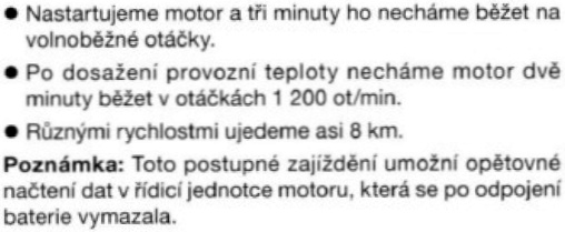 Nastavení ŘJ po odpojení baterie se podle Etzolda dělá takto:opicihlava píše:Potřeboval bych poradit s podobným problémem, mám FOFO 1999 1,6 benzín, při nabíjení baterky jsem ji odpojil a po připojení mi motor při zahřátí na volnoběh chcípne, otáčkyy spadnou na nulu a je to... Někde jsem se dočetl, že to souvisí s nastavením řídící jednotky...