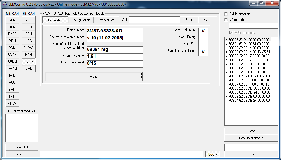 Pořád si stojím za svým, že žádná hladina se neměří. To co vyčteš z elm-configu jsou hodnoty, které ti dává řídící jednotka pro aditivum (FACM) a to je ta co to počítá a usoudí, že je aditiva málo.