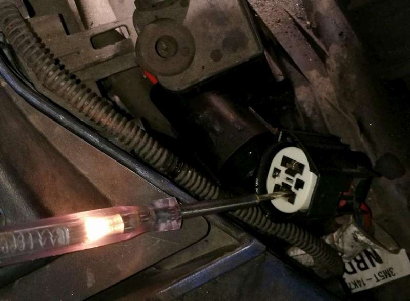Na obrázku jde vidět přeměření samice konektoru,kde proud je.Potom jsem jsem připojil samce mínus ventilátoru s kostrou auta a plus na baterii. A nic.Myslím,že to nespojuju špatně...