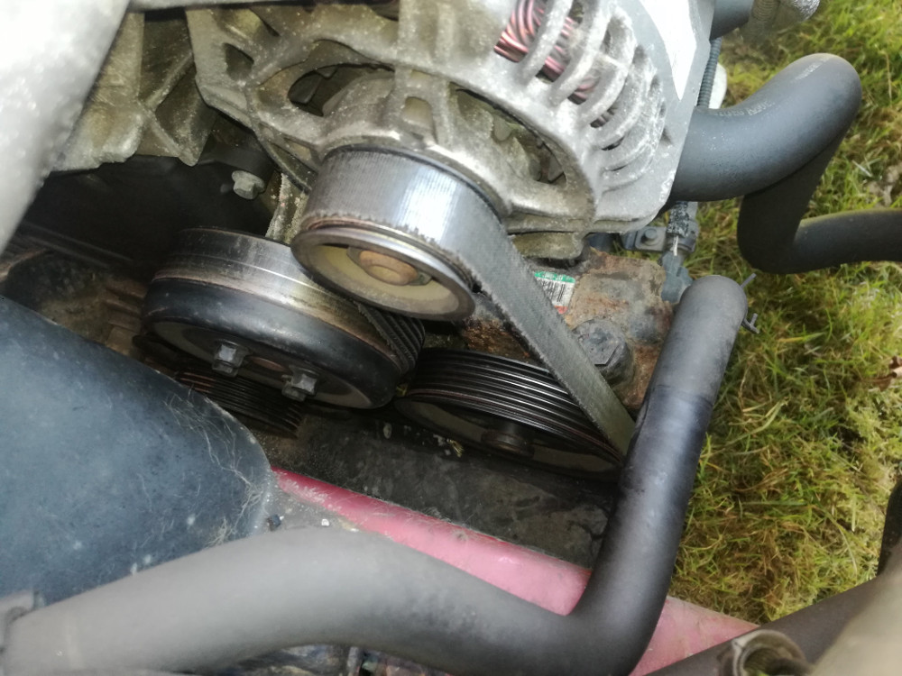 A další věc, co mi vrtá hlavou je, proč na řemenici na klice mám nasazenou ještě druhou řemenici pro druhý řemen, který tam ale neni. Takhle to mám třeba řešený na bmw, že na klice jsou 2 řemenice a ta druhá co je víc vepředu je pro malý řemen jen pro klimu, jenže tady je i ta klima řešená pouze jedním, ale delším řemenem.