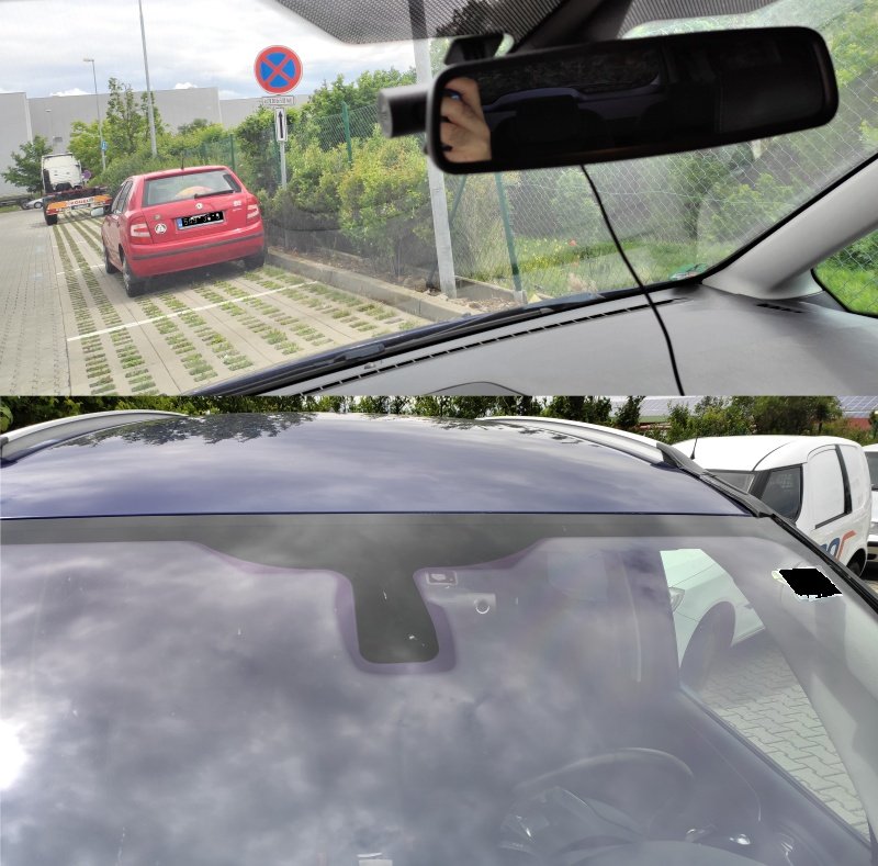 Jak drží jen na GPS modulu, tak tělo kamery funguje jako páka a vždycky se po pár týdnech ukroutí a spadne dolů. Takže následuje kolečko: očistit ředidlem sklo, gps modul, nalepit novou oboustranou lepící pásku, přilepit a .... za chvíli opět upadne. Zkoušel jsem všelijaké oboustranné lepící pásky - slabé, střední, tlusté, extra pevné a nic, všechny vydrží nejdéle dva týdny a kamerka ze skla spadne dolů.