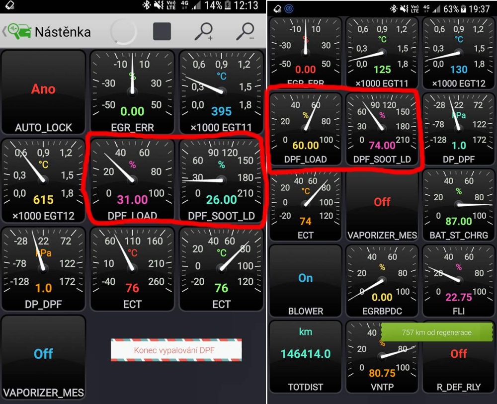 Jeho hodnota DPF_LOAD je po vypálení cca o více jak 10% nižší než moje (43 versus 31). Co mám info, tato hodnota má ukazovat celkové zaplnění filtru, zatím moje sledovaná DPF_SOOT_LD je nějaká cyklická ukazující stav v režimu mezi vypálením.