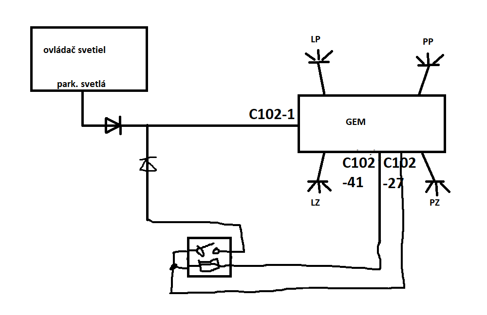 ZaQik, keby som chcel rozsvecovať parkovačky, mohol by som použiť nasledovné zapojenie? S tým, že nechcem prerušovať každý drát na svetlo, ale len jeden od vypínača svetiel: Prípadne dá sa to nejako zjednodušiť? Alebo chýba tam ešte niečo chýba? Chcem použiť SSR relé aby mi to necvakalo a chcel by som rozsvietiť predok aj zadok auta, nie len DRL. Rozsvecovanie skrz relé je len pre predstavu znázornené, viem že tam je viac drátov.ZaQik píše: 24.05.2017 05:16 pokud bys chtel rozsvecet predni i zadni obrysovky, tak bys musel prerusit 4 draty z GEMu (predni prava, predni leva, zadni prava a zadni leva), dat na ne diody a privest napeti pomoci rele (staci jedno) ... nevyhoda je, ze diody trocu snizuji napeti, takze obrysovky budou lehce min svitit a HLAVNE, jedna se o postupne stmivani, takze rele pri pohasinani bude hlucne cvakat (nutno ho poradne zabalit do izolace)