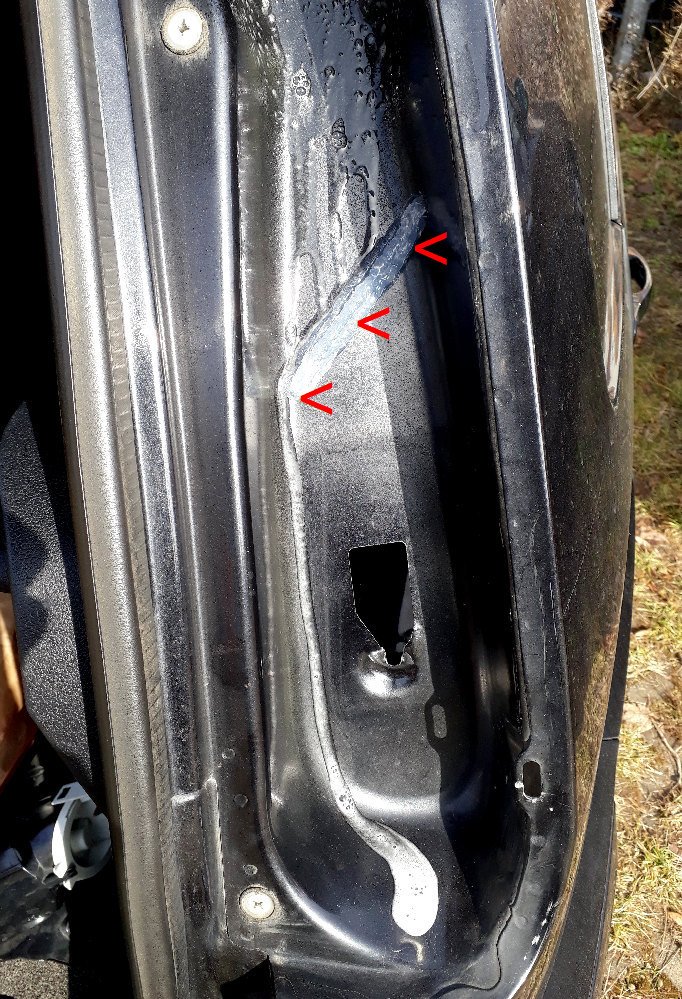 Voda se tam dostává tak, že stéká ze střechy a pod světlomet a tam se při netěsné gumě mezi tělesem zadní lampy a karosérií dostane až do otvoru pro dráty a pak i do kufru: