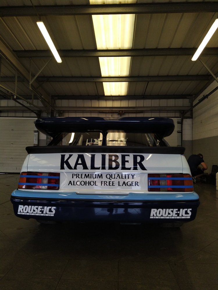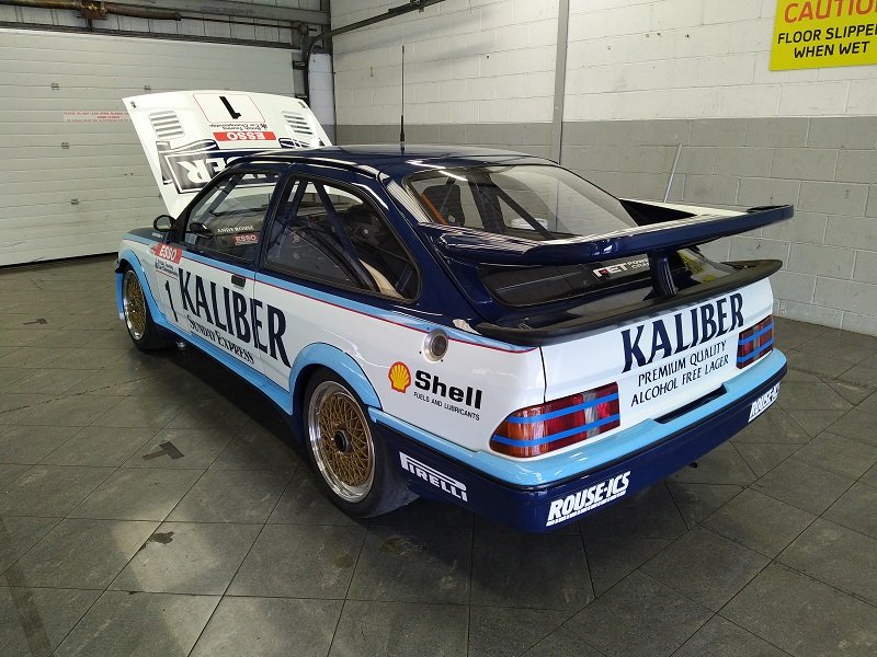 Už jsem v depu! Pro mě totální překvapení a vůbec vrcho celého Ford Fairu. Než jsem tam jel, tak jsem doufal, že někdy uvidím na živo Sierry RS500 Cosworth , ale nečekal jsem že uvidím mojí srdcovku v barvách Kaliber, kterou stavěl a pilotoval sám Andy Rouse, asi vůbec nejslavnější závodník BTCC. kousek od ní pro změnu Sierra RS500 Cosworth od Eggenberger jako jediná ( ikdyž původně samozřejmě černá ) ve světlých barvách Bastos, která vyhrála 24hodinovku na okruhu ve SPA, se kterou jezdil Gianfranco Brancatelli. Jedna z mála levostrancýh RS500. Za okny obou závodních legend papírky s pořadovým písmenem a číslem - takže budou jezdit na trati! K tomu ale později. Pro mě opravdu splnění snu. Stojím u Andyho Sierry a je zvláštní jí pozorovat. Byl to vůz ze sezóny 1989, který sice nebyl tak úspěšný jako ten v sezóně 1988, ale ne o moc. Na první pohled je poměrně dlouhá, až Vás zaskočí jak je úzká a nízká. Závodní verze už měla 17" kola na 3dílných křemíkových BBS ráfcích a pochopitelně na slickách. Byl jsem jako u vytržení, když mi majitel po otázce, jestli mohu nakouknout dovnitř spojeně řekl "Yes, of course" a mohl to vidět i zevnitř. To nejlepší na závěr - stojím přímo před motorem a jen žasnu. Dvoulitrový motor, dvě vačky, 4 válec a turbo T04 natlačené k 2,5 baru a výkon 560koní....Je prostě šílené, že s tím v dobách slávy dokázali jet 189 mph/h ... Okolo tohoto auta jsem stepoval nejvíc a něchtělo se mi od něj vůbec odcházet. Paradoxně, nakonec jsme se k němu vrátili ještě jednou, prostě u mě, to ani jinak nešlo:) Dalo by se v tu chvíli říct, že kdyby jsme po tomhle setkání museli už odjet, já bych odjížděl spokojený a klidný se spokojeným úsměvem!
