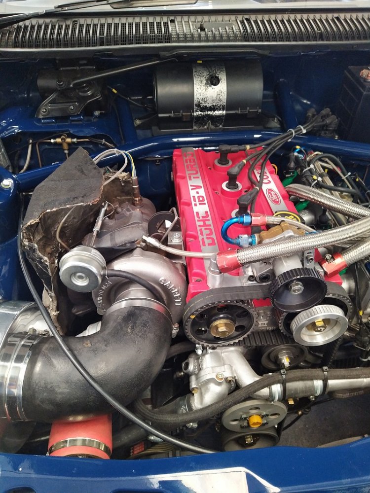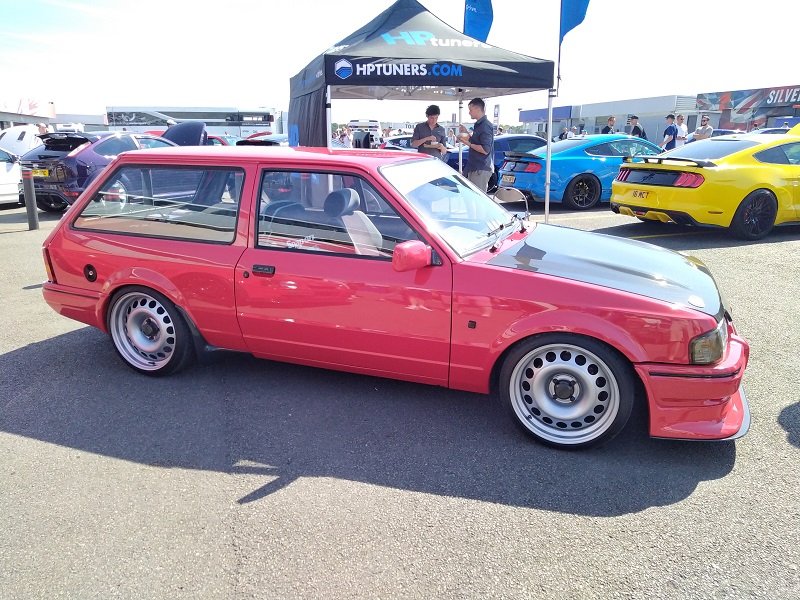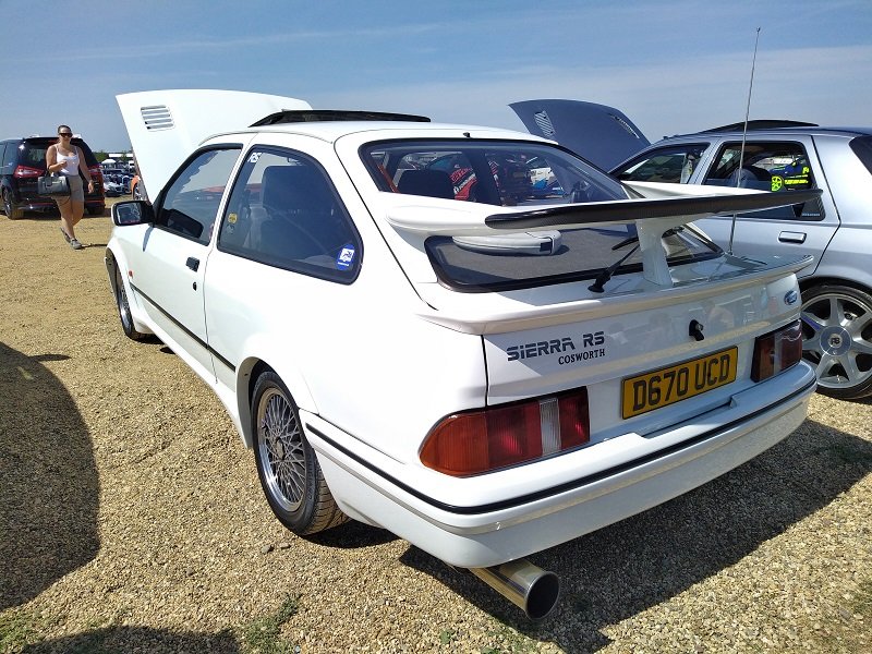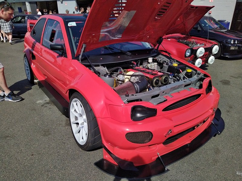 Jízdy pokračovaly během celého dne, takže jsme šli dál po okruhu sledovat, co vše ještě můžeme vidět. Za zmínku stojí určitě stánek hlavního sponzora Mountune. Stály se tam velké fronty v turniketech na prodej dílů - a že to tam chvíli vypadalo, jako kdyby ty věci dávali zadarmo. Za menším hloučkem lidí - závodní verze Ford RS200. Jdeme dále - nacházíme místo se stánky s občerstvením a autokosmetikou. Před ním stojí stará hranatá Fiesta - s motorem YB Cosworth a Turbem T04, přestavěnou na zadní náhon. Majitel patrně šílenec. Asi po další půlhodině procházení mezi zajímavými kousky, které byly různě zatoulané - jako třeba pár Focusů RS MK1, které nestály u hlavního dvojřadu. Co jsme tak pochopili, tak jsou určité zóny, kde jsou určitá auta pospolu a pak ještě zóny, kde jsou kluby. Takže proto se kolikrát objevily auta různě rozházená. Ale bylo to svým způsobem takové pestřejší a vlastně dopředu nikdo nevěděl, co tam bude stát. Po chvíli vidím první Sierru RS Cosworth v bílé barvě a 3dveř s ploutví. Není to RS500, ale první civilní třídveř. Vedle něj Saphire RS Cosworth. Oba kousky přepečlivě umyty a naleštěny. Kousek od těchto krásných kousků procházíme místem, kde byla burza s díly, stánky s různým oblečením, nálepkami, kosmetikou, díly, modely autíček až po občerstvení. Na chvíli odběhnul Mates - ikdyž tam nebylo tak přelidněno jak jsem čekal, během pár vteřin byl pryč. Za chvíli se objevil, drapnul mě a že se asi poseru! - No skoro ano, Ford Capri, ale překopaný dobovým týmem DRM (předchůdci DTM) Zakspeed. Takže na place stál Ford Capri Zakspeed Turbo. Upřímně bych tohle čekal spíše mimo Anglii, ale tohle mě dostalo! Byly dvě varianty motorů - 1,4 Turbo 480koní 9200 ot/min a 1,7 Turbo něco přes 600koní a stejně točící se nesmysl...Přiznám se, že nevím která jednotka v tom byla, ale bylo to šílené, vidět to na vlastní oči a z blízka. Auto z trubek o váze kolem 800kg s takovým výkonem. Masivní bodykit a pod dlouhou kapotou malý brutální mixér, který ve své době neměl konkurenci. Takže zase zpět nohama na zem a jde se dál. O kousek dál nám zase předvedli angličani zlaté ruce a lidovou tvořivost. Focus RS MK2 Cabriolet... To už se po sobě díváme, jestli nemáme úpal, ale tam to asi krom nás 4 nikoho ze židle nezvedalo. Pomalu jsme dostávali hlad, takže jsme se odebrali směrem ke stánku. Po cestě nacházím první Sierru RS500 Cosworth v originál verzi, ale místo T04 bylo turbo Borg Warner. Přicházíme ke stánkům na anglický cheesburger, který byl snad asi nejlepší, jaký jsem kdy jedl, až na uřvanou prodávající, která byla jako papoušek a v okruhu stánků jsme slyšeli jen ji a její " Next please! " . Nicméně sedímena u stolu a díváme se na Mustang Shelby GT500 Eleanor...Po jídle jsme pokračovali v procházce dále. Na jednom place bylo asi 20kousků Fiesty ST200 v šedé barvě. Po cestě vidíme palouk, kde z dálky září oranžová asi 80ks ST Focusů MK2 a MK3, nacházíme Escorty, Mondea, Escorty ve verzi kurýr, Sierru pickup. Mondea ST220....bylo toho tolik, že se to nedalo ani všechno zapamatovat a fotit.