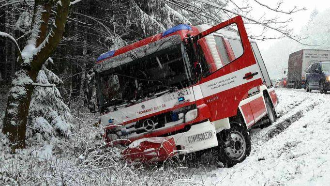 ukázku reálných hrozeb českých silnic - vytlačení ze silnice, čelní náraz i sníh.