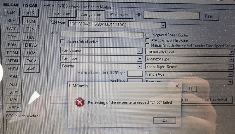 Rychlost je 38400bps. Jednotka PCM a když chci načíst data z jednotky vyskočí mi ta hláška.