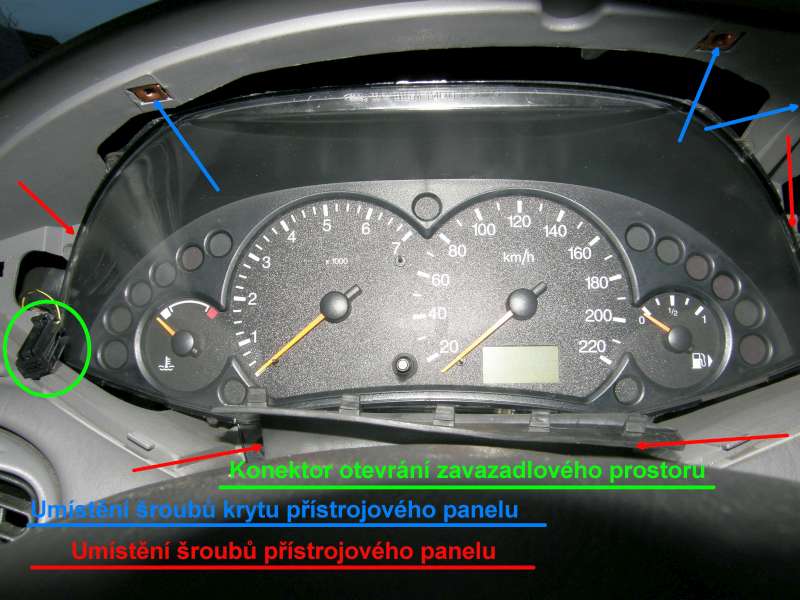 I když ti ten odkaz nepůjde, to nevadí. Potřeba je křížový šroubovák a bitty na šrouby s hvězdičkou. Na plastovém krytu přístrojovky jsou nahoře tři šroubky. Po jejich vyšroubování lze kryt tahem sundat. Vlastní panel je uchycen na čtyřech šroubech. Panel povytáhneme, už drží jen na kabelu. Ten je proti samovolnému vysunutí chráněn západkou. Je nutno zmáčknout západku a odklopit takovou hrazdu (černá plastová) a konektor sám vyjede. Na zadní straně panelu je přístup k žárovkám. Přístup k osvětlení kilometrů bude asi pod plastovým krytem, který je přišroubovaný šroubky s hlavou na TORXY (hvězdička). O víkendu budu asi montovat venkovní teploměr a tak to zkusím prozkoumat jakým způsobem je řešené osvětlení ukazatele km.