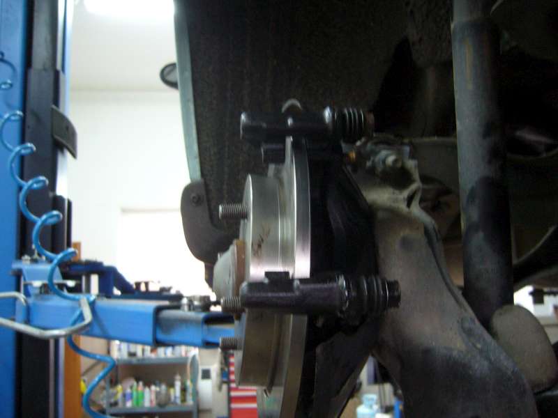 Náboj pro kotoučovou brzdu s čidlem ABS Vezmeme náboj pro kotoučovou brzdu, plus příslušný krycí plech kotouče (pozor je levý a pravý!!!) a přišroubujeme jej 4 šrouby na rameno místo bývalých bubnů. Přišroubujeme zpět tlumič!(v pozadí Foki při výměně) Na náboj nasadíme kotouč. Ten musíme předem odmastit, a v místě kontaktu s nábojem jej namázneme měděnou vazelínou. Nasadíme část brzdiče v níž jsou nasunuty brzdové destičky edit: zkontrolujeme , zda stefty volne "plavou" pokud jsou zatuhle dojde ke sjizdeni desticek a nepravidelnemu opotrebeni kotoucu Nasadíme brzdové destičky