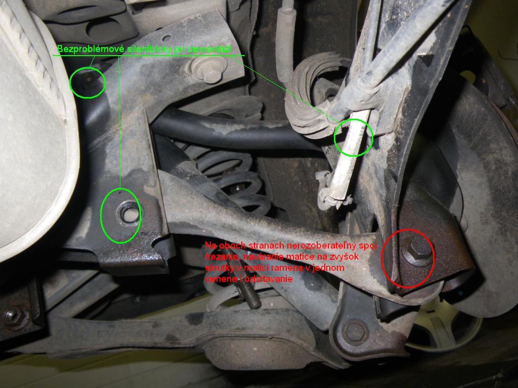 - nešli rozobrať spodné spoje dolného priečneho/plechového/ ramienka ani na jednej strane - skrutka zahrdzavela s kovovou trubkou silenbloku a vyskrutkovávaním rozťahovala plechový domček - nechcel som riskovať jeho poškodenie a tak sa na oboch stranách rezala(veľkým rezným kotúčom veľkou flexou). Jedna strana - hlavička slrutky bola tým pádom out a druhá strana - trčiaci závit skrutky - privariť inú maticu M12 a pokúšať sa dostať ju von - ale skrutka sa odkrúcala - tak zostalo už iba odvŕtanie na pravej strane a potom prebehnutie závitníkom. Na ľavej strane to po privarení matice šlo - asi na 6x po opakovanom vstrekovaní lubrikantu.