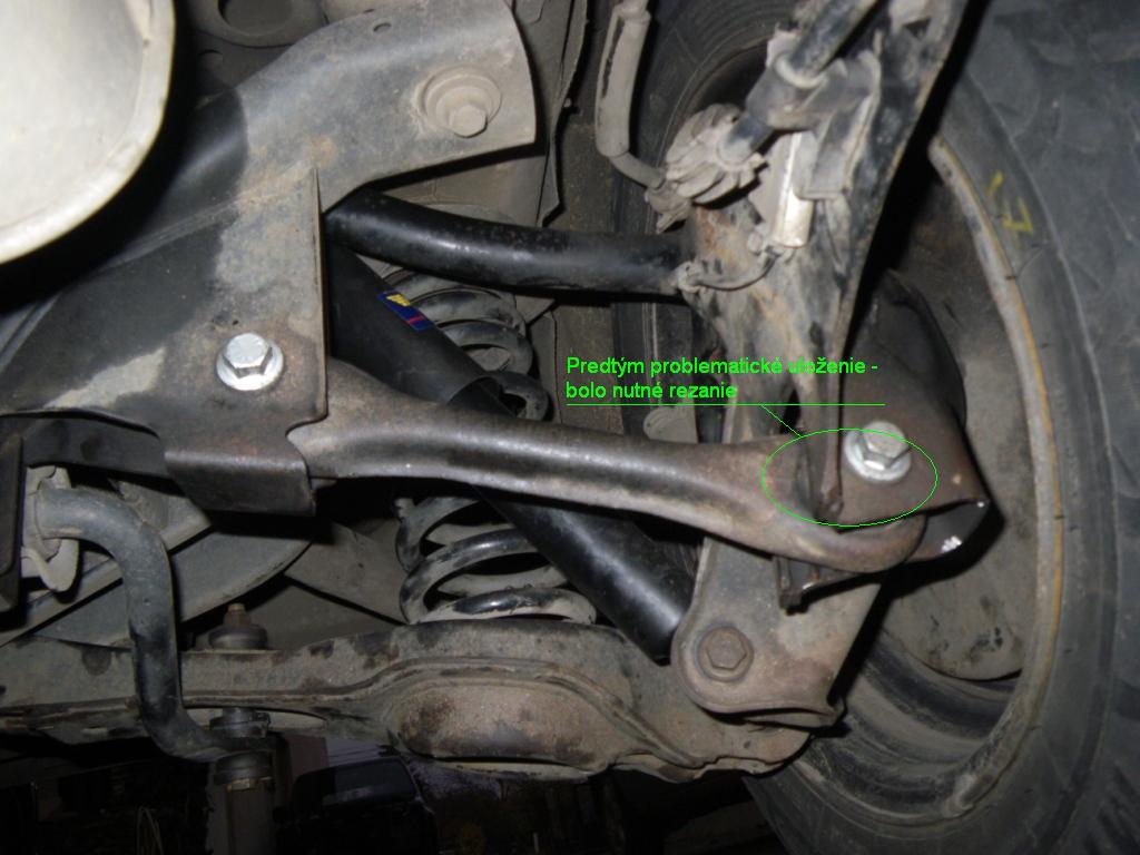 No úplne všetky nie - nemenil som tie čo sú v tom spodnom priečnom ramene (Ľ+P) - jeden /silentblok/ je kotvenie v pozdĺžnom ramene vzadu a druhý bod/silentblok/ je v uložení nápravnice s excentrom - skrutkou s excentrickou hlavou, ktorej natáčaním sa nastavuje zbiehavosť zadných kolies. Oba nemenené silentbloky sú zalisované v tom priečnom spodnom ramene zadnej nápravy v ktorom je i spodná miska pružiny.