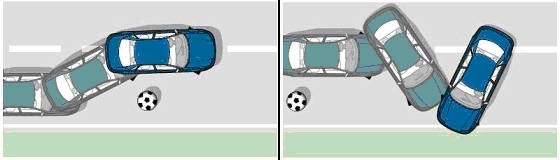 Uvažujme nejprve vozidlo bez ESP. Řidič se vyhýbá předmětu na vozovce, a proto nejprve trhne volantem doleva a následně doprava. Po tomto vyhýbacím manévru se zadní část vozu pohybuje rychleji a vozidlo se dostává do smyku. Otáčí se kolem svislé osy a pro řidiče je neovladatelné