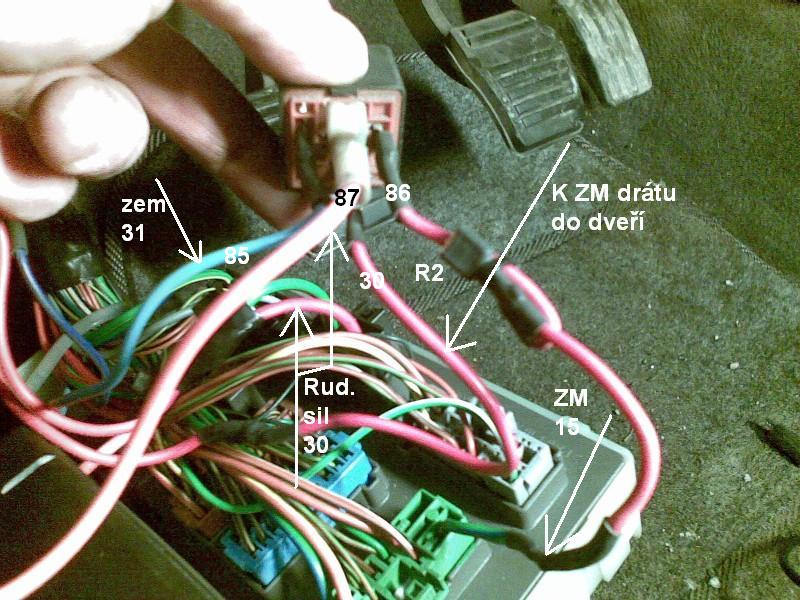 Na první stránce je mírně upraveno schéma zapojení.U R2 jde spínaný kontakt přímo z 12V-(30).Jinak sem zkusím umístit pár obrázků z mobilu -omluvte kvalitu a provedení zapojení , neměl jsem jinou barvu silného drátu.Snad to bude srozumitelné.Drát od dveřního kontaktu jsem vytáhl od prahu a dovedl až k relé.Je tam špatně vidět ,ale je tmavomorý.