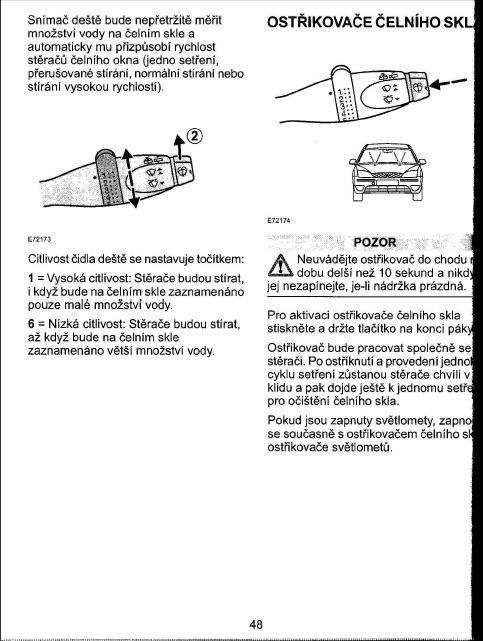 1. holá páčka a zapnutí jen do 1. polohy nahorů. Pokud je páčka zapnuta při nastartování tak stěračé automaticky jednou přejedou přes sklo (předek vždy a zadní pokud je zařazeno R) a proto je lepší vždy vypínat.