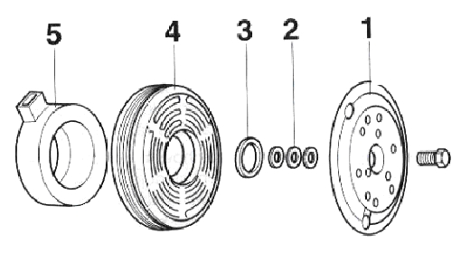 elektromagnetická spojka, která zajišťuje pohon kompresoru při zapnutí klimatizace a vlastní kompresor (s kývavým kotoučem - viz. 1 příspěvek).