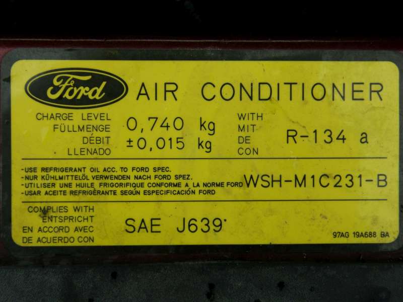 Nachází se na předním čele motorového prostoru, kousek od zámku kapoty. Je na něm uvedeno množství chladícího média (R 134a - chlazení + PAG olej - mazání). To je 0,740 kg +/- 0,015 kg. dále specifikace Fordu a Bezpečnostní standardy pro motorová vozidla Refrigerant par Compresssions systémy (SAE J639).