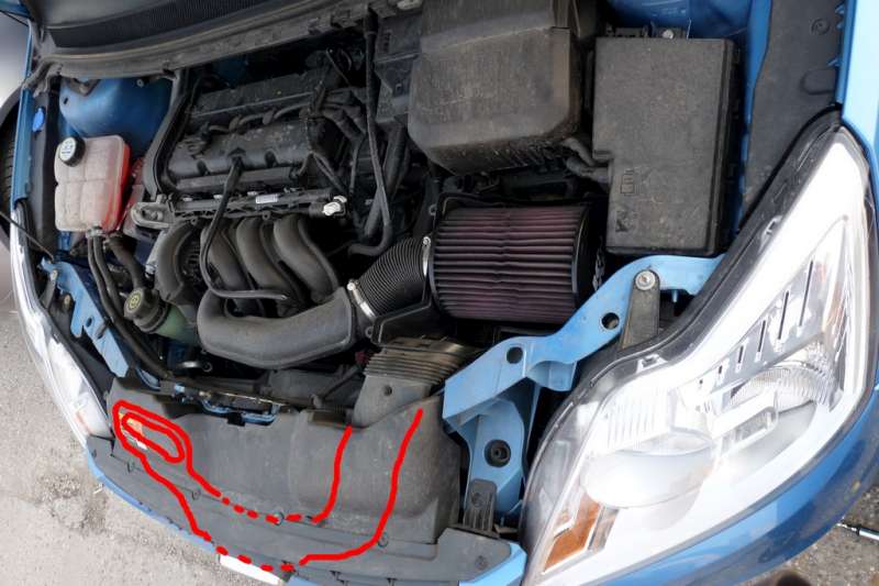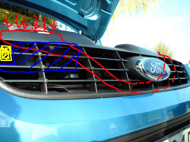 červenou je "trubka" nasávania, ktorá končí tesne pod tým horným plastom s nasávaním zhora, čiže náporový vzduch zpredu sa musí stočiť najpv hore popod horný plast a potom o 90° smerom dole pod znak FORD atd... zasa hore do filtra... no des :roll: (aj ked chapem ze asi opatrenie proti vnikaniu vody...)