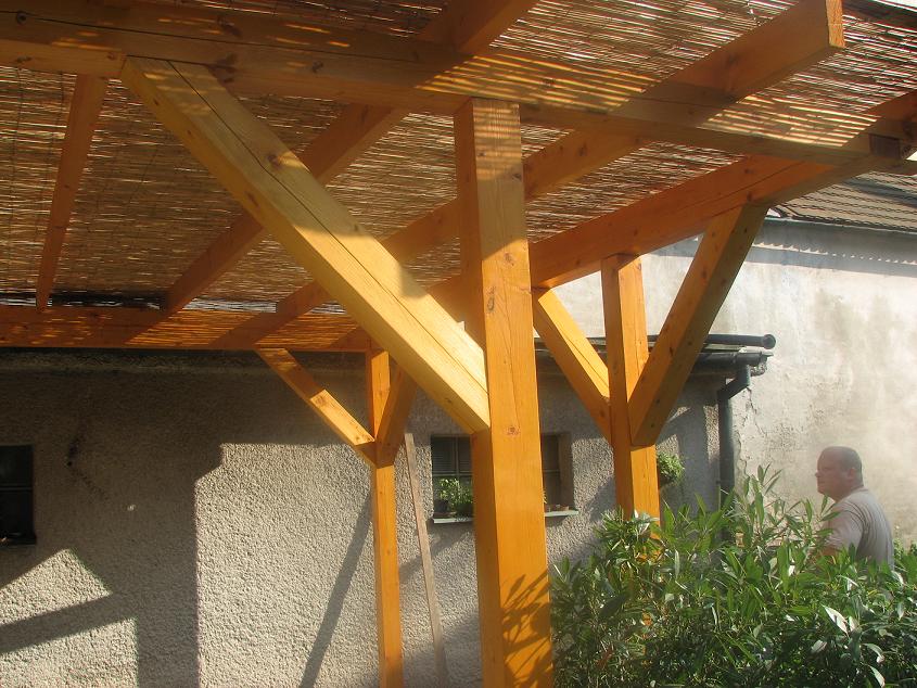 Cele to začnulo tym, že moja draha milovana bonzacka manželka furt vyrypovala, že chce vysedavať na dvorku a že němože, bo ji sviti oskar do ksichta a že něvidi na skrebliki a že hic a take ty kidy. Tuž pergolu zrobiť. Propatral sem paru navodu na stavbu takich tych dřevjanych cipovyn a z vyrazem absoloventa tesařske univerzyty sem začnul zadavať zakazki jednotlivym subdodavatelam. Švager zrobil patki, bo je zamečnik, znama dodala dlažbu, bo chce jinu, kamoš dodal dřevo, bo ma katr a ja sem se pustil do stavby, bo sem cyp. Všecko šlo jak po dratkach, než mi hruba konstrukcija jebla na zem, bo baby se myslely, že jak už to drža dva hřebiky, tuž něni třa držeť stojky. Zavolal sem suseda, bo je tesař. Od te pory už akurat podavam kladivo, hřebiky, metr a ine, a tež robim zasobovača, bo moja zmyšla každu chvilu ine koncepcije celkoveho dojmu charakteristiky zasazeňa vysledneho celka do prostora přylehleho ku baraku. Eště že sem se nězrobil projektovu dokumentacju, bo by sem ju šestrazy přerabjal.