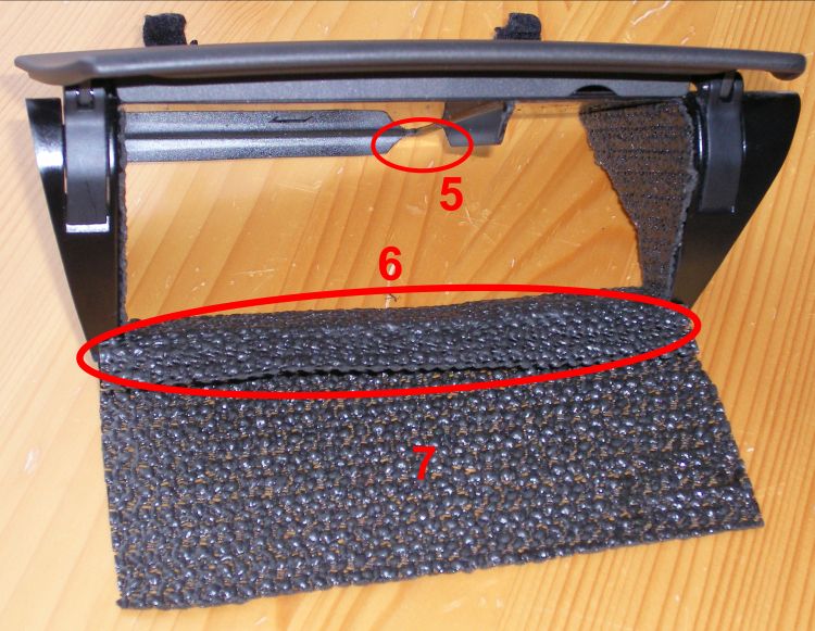Já to udělal tak, že jsem plasty tvořící část se zapalovačem vysunutým dopředu celou vyříznul tak, aby mi dole zbyl cca. 1 cm plastu (1) směrem dovnitř a cca. 5 mm plastu z vrchu ze stěny podél šuplíku zapalovače (pro zpevnění) (2). Strop a postranici, které drží mechanizmus zavírání, jsem nechal pochopitelně celé. V části, kam se zasouvá šuplík jsem nechal zase cca. 1 cm plastu dole (3), celou bočnici a strop a cca. 5 mm plastu vzadu nahoře (opět pro zpevnění) (4). Jen v místě, kde ty zanechané 5 mm plasty tvoří roh, jsem to musel vyříznout (5), protože přímo pod tím je zapalovač a blbě se tam pak něco zasouvalo. Doma jsem našel (myslím z OBI) protiskluzovou podložku do zásuvek, polepil obě bočnice přesně na míru a udělal si pás, který jsem vlepil na ten cca. 1 cm plastu, který jsem nechal na spodní straně předního rámečku (1) a (3). Zároveň to bylo střižené tak, aby o něco širší část koukala ještě dopředu (6) a za přilepenou částí bylo široké přes celý kastlík (7) (až za bočnice předělané kuřácké přípravy) a po vložení na místo vzadu až na horu. Na obrázku je to ohlé dopředu. A na konec to jen poskládat dohromady.