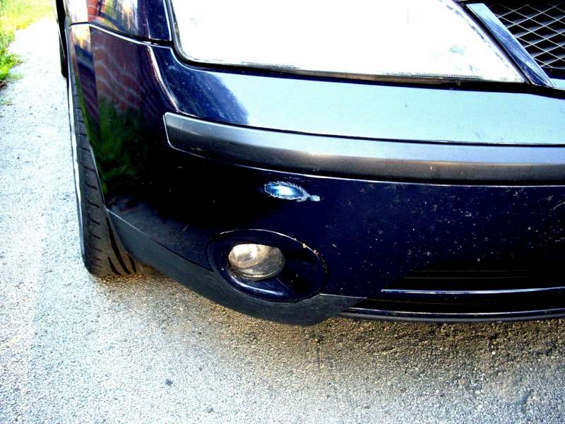 Lak tam je škráblý, ale ne moc, ta bílá barva je hlavně z toho auta co mi to udělalo. Tuším dokonce které to bylo, ale dokazuj to... Asi před půl rokem jsem na vlastní oči viděl jak nějaké holka při couvání nabuřila do blatníku auta na parkovišti, který úplně promáčkla a ujela. Stál jsem asi 3 m vedle, takže SPZ-ku jsem měl, a pro poškozeného to dopadlo dobře. No asi počkám do konce zimy, jestli něco nepřibyde a nechám to opravit až pak.
