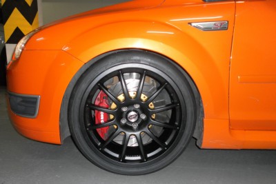 Focus II. ST - r.v. 2006, úprava Wolf Racing (340 PS,545 Nm), Bilstein B16 Gewindefahrwerk PSS9, AP Racing (kotouče 362 mm, 6 pístků) - desky Raybestos směs ST31, samosvorný diferenciál Quaife, výfuk MILLTEK turbo back, Semi Slick TOYO R888